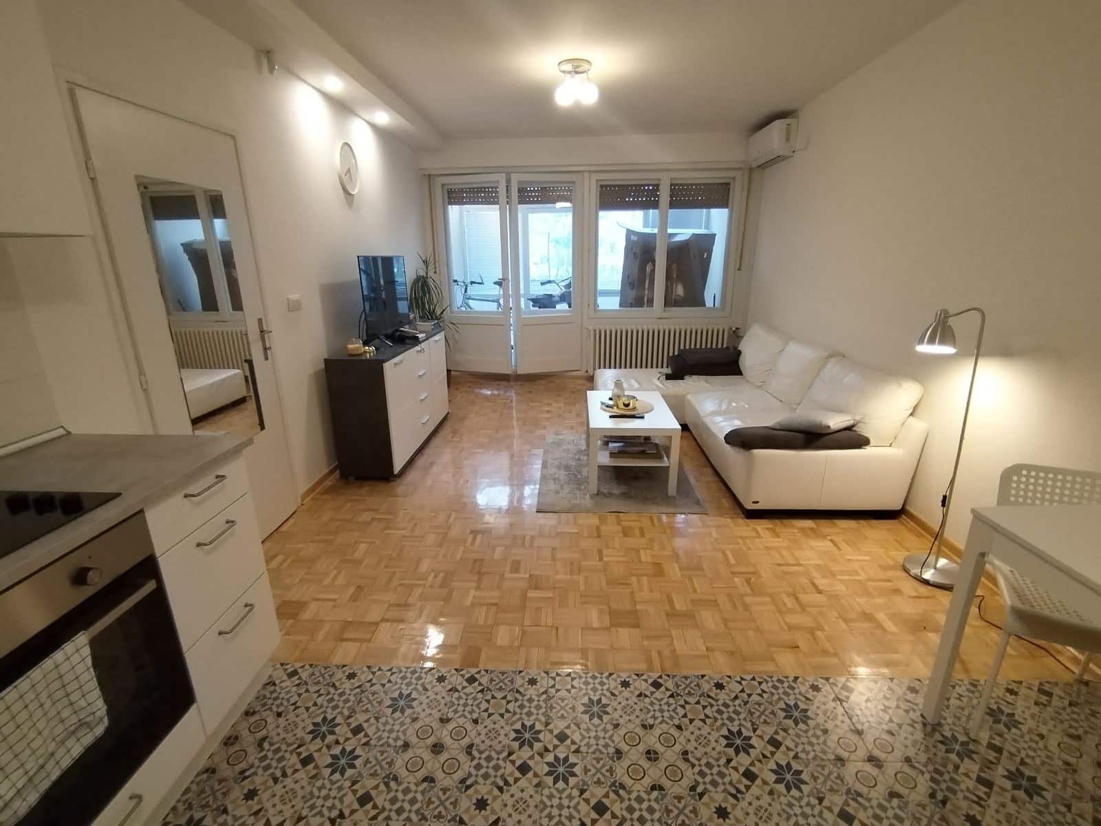 Prostorije: antre, dnevni boravak sa kuhinjom i trpezarijom, spavaća soba, kupatilo, zastakljena lođa.